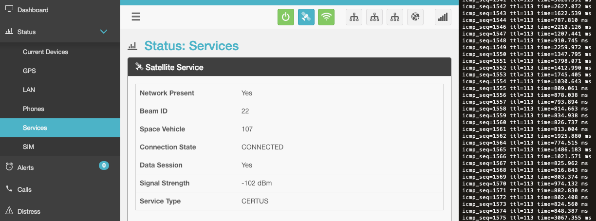 También comprobamos rápidamente que la conexión de datos Internet, aunque esté habilitada y la SIM esté lista y conectemos un compu a las puertas Ethernet, no se inicia sola. Y tampoco se inicia con algún botón en el BDU. La conexión se inicia a través de la interfaz web, y una vez iniciada se auto-inicia cada vez que el terminal se enciende, a menos que a través de esa misma interfaz uno la apague.